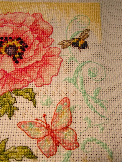 Od kilku wieczorów najwięcej czasu poświęcam poniższemu obrazkowi. Jest to zestaw Dimensions, który kupiłam już dawno temu, ale nie mógł się doczekać na swoją kolej. Niestety już na początku napotkałam na problem, tzn zabrakło mi jasnoróżowej nici!! i to nie na kilka krzyżyków a na prawie połowę objętości tego koloru! Zaskoczyła mnie taka niedoróbka, ale poradziłam sobie inaczej-zamieniłam Dimensions na DMC, akurat posiadam ten kolor w swoich zbirach i pasuje idealnie.