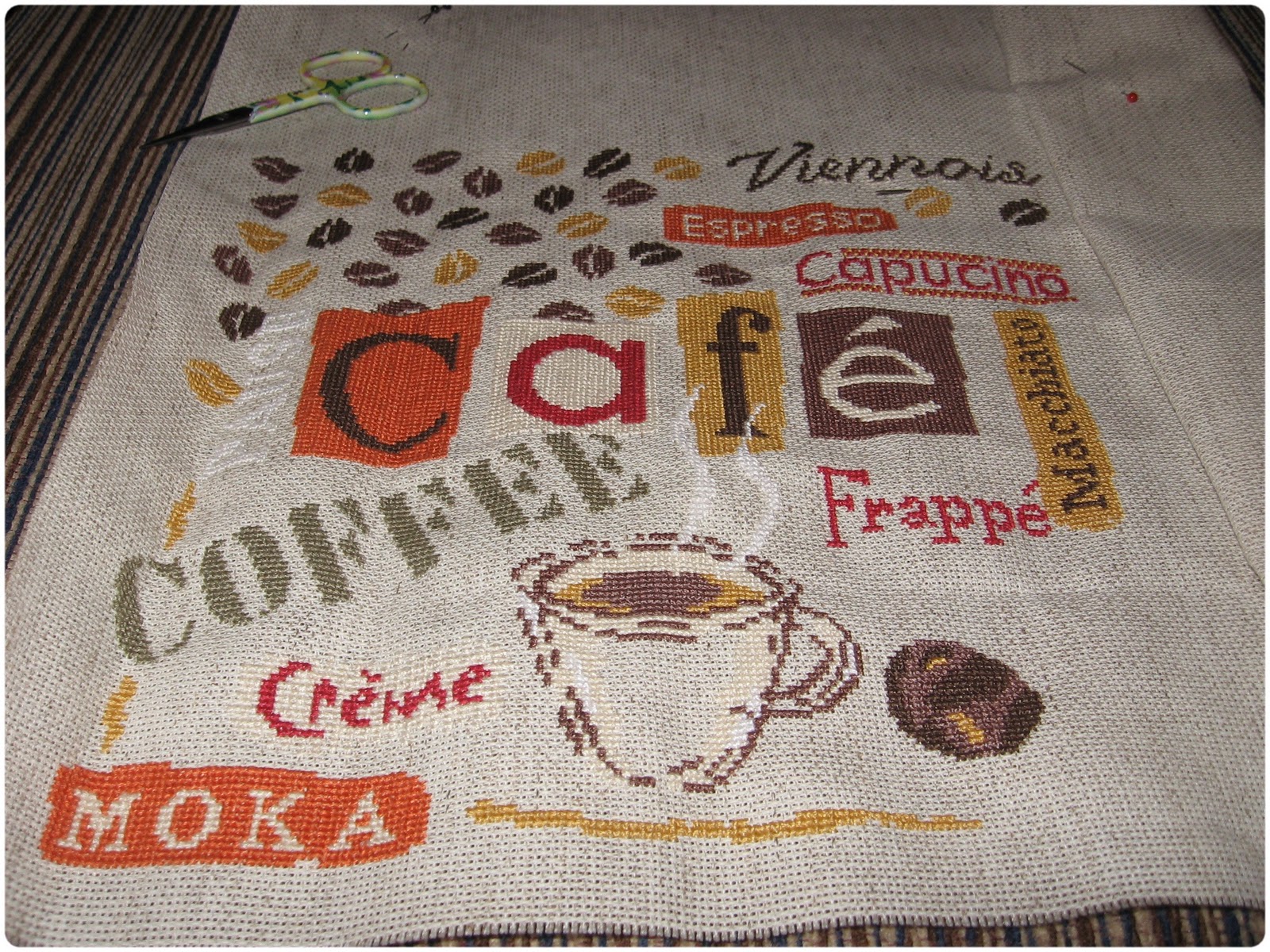 obecnie pracuję nad haftem "le cafe". Jestem już na końcówce, haftuje mi się go bardzo dobrze. Obrazek składa się z wielu małych części, więc nawet niekompletny wygląda całkiem dobrze