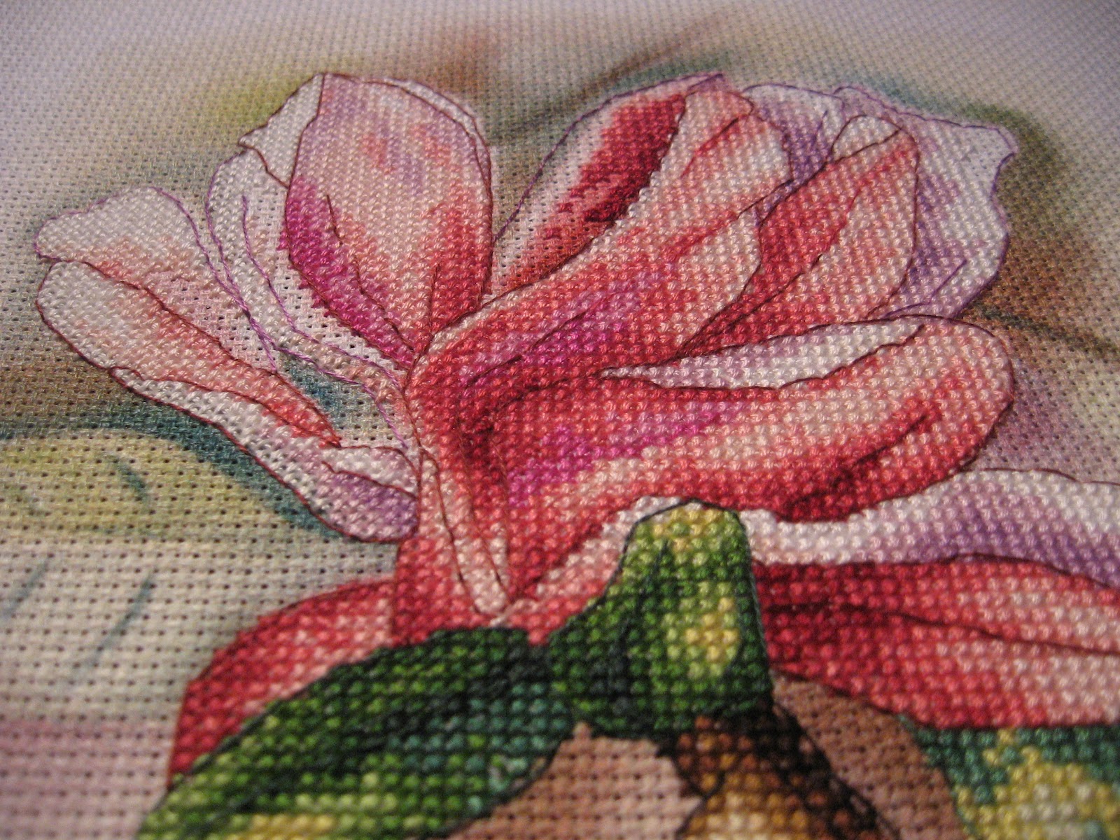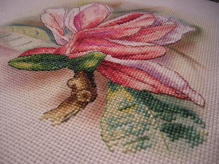 W zeszłym roku na Dniach Kraftu 2011 zakupiłam zestaw Orchidea na podmalowanej kanwie. Zabrałam się za niego natychmiast, ale pod koniec mój zapał opadł i rozpoczęłam inną robótkę. I tak od czasu do czasu orchidea wpadała mi w ręce, ale zawsze ją odkładałam. Dziś wyciągnęłam ją po raz kolejny i ku mojemu zdziwieniu okazało się, że zostało tylko kilka backstitchy do wykonania. I tym oto sposobem obrazek został dokończony