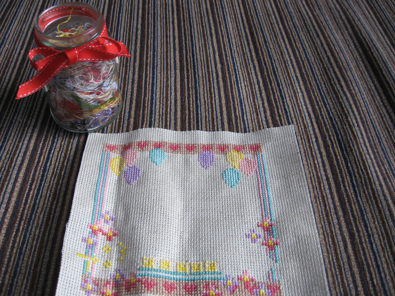 Obrazek ślubny pomału nabiera kształtów. Haftuję tym razem bez tamborka co niestety widać po zagnieceniach ma materiale. A w tle tusalowy słoiczek.